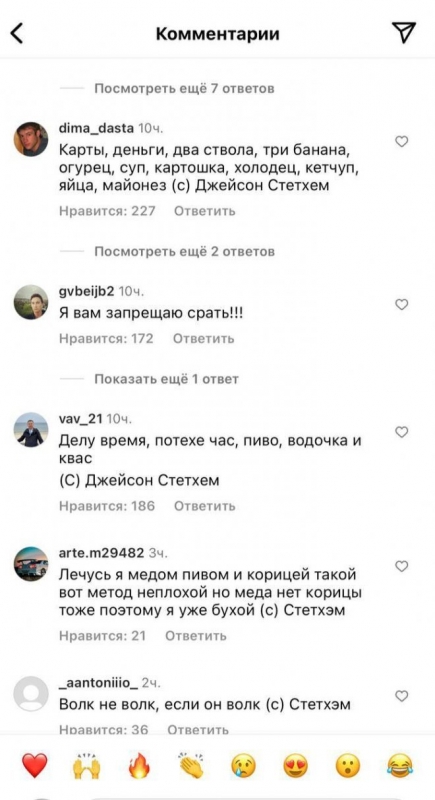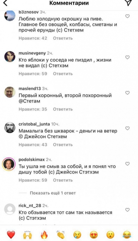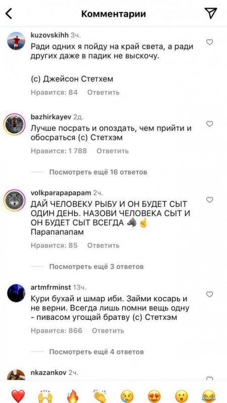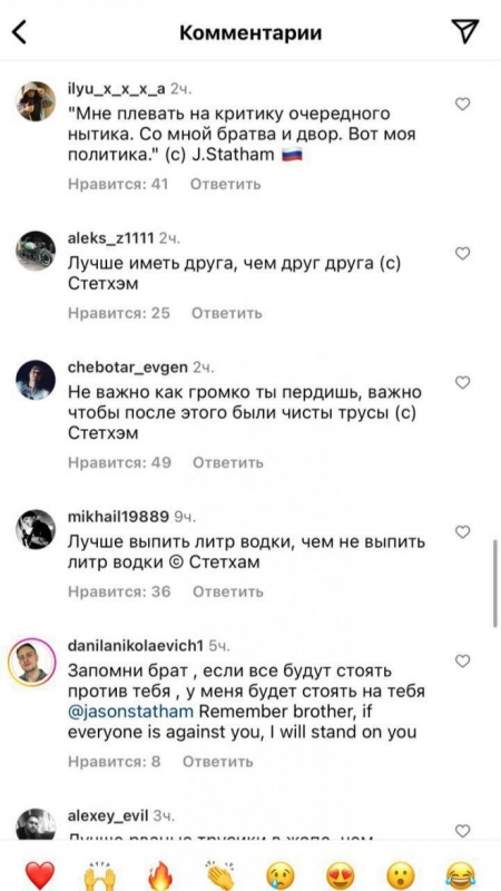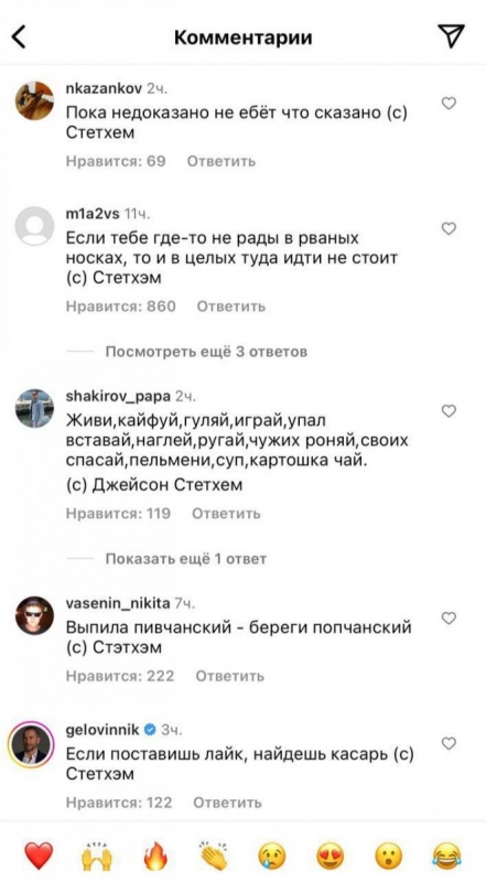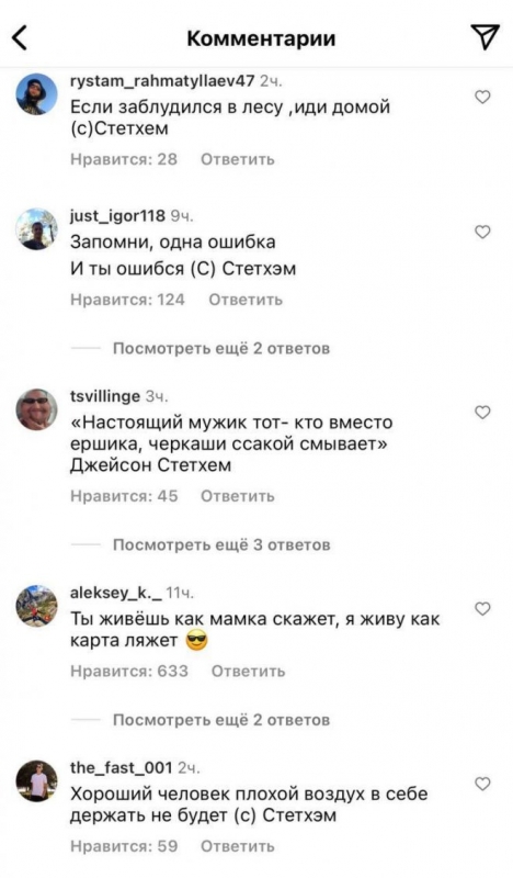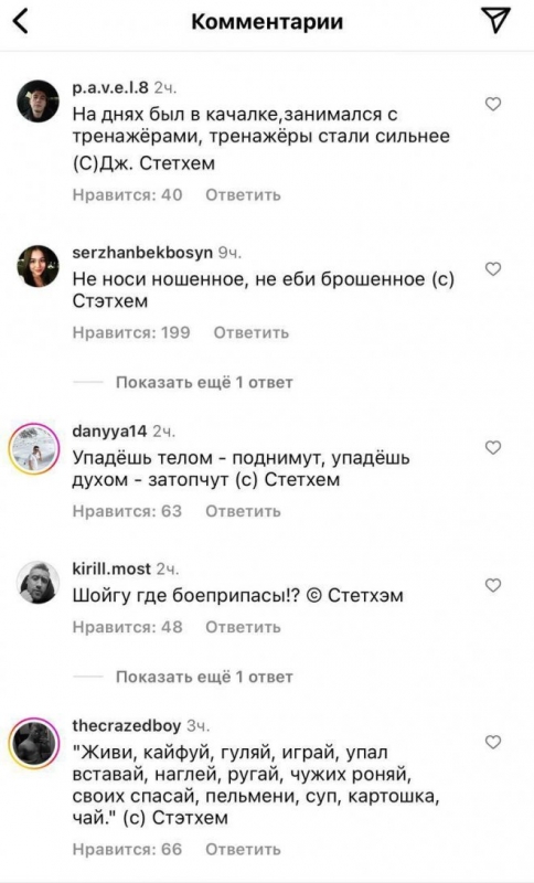 Актер Джейсон Стейтем выложил очередной пост на своей страничке в социальных сетях и получил множество интересных комментариев от русскоязычных пользователей. Нетрудно догадаться, что шутники решили привести различные цитаты, которые в Рунете якобы приписывают знаменитому актеру. Давайте же посмотрим, как это было, в продолжении.