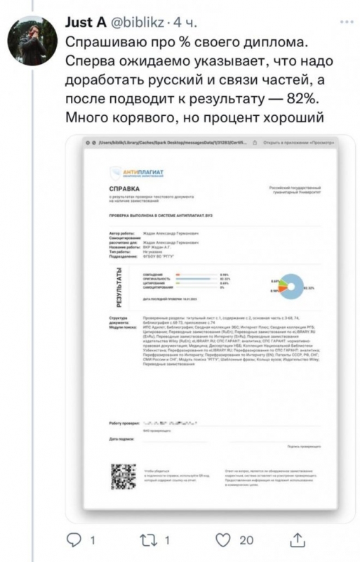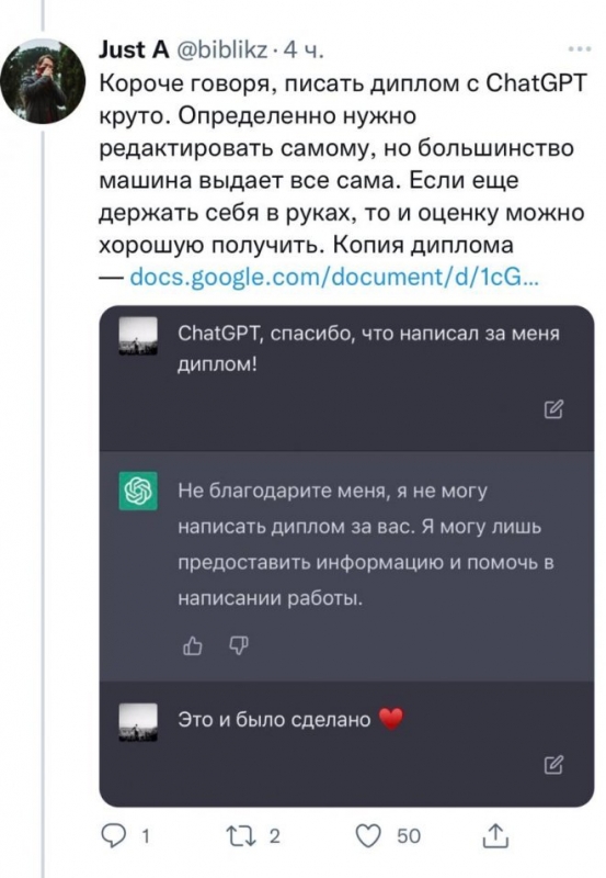 Один московский студент успешно написал и защитил диплом, который был написан с помощью современной нейросети ChatGPT. Оригинальность диплома составила 82 процента, а на все сопутствующие моменты студент потратил около 23-х часов. Давайте же узнаем, как это было, в данном посте.